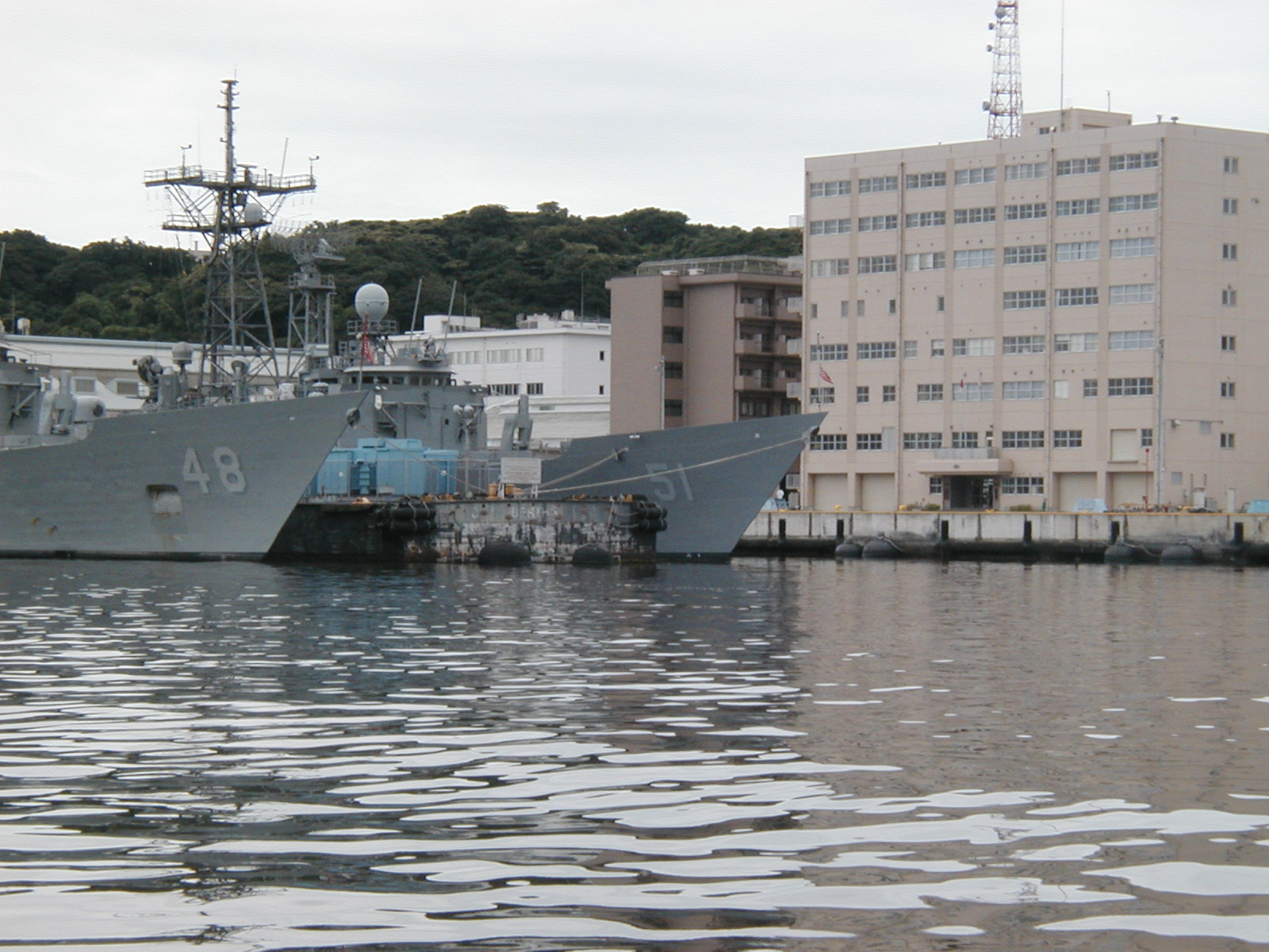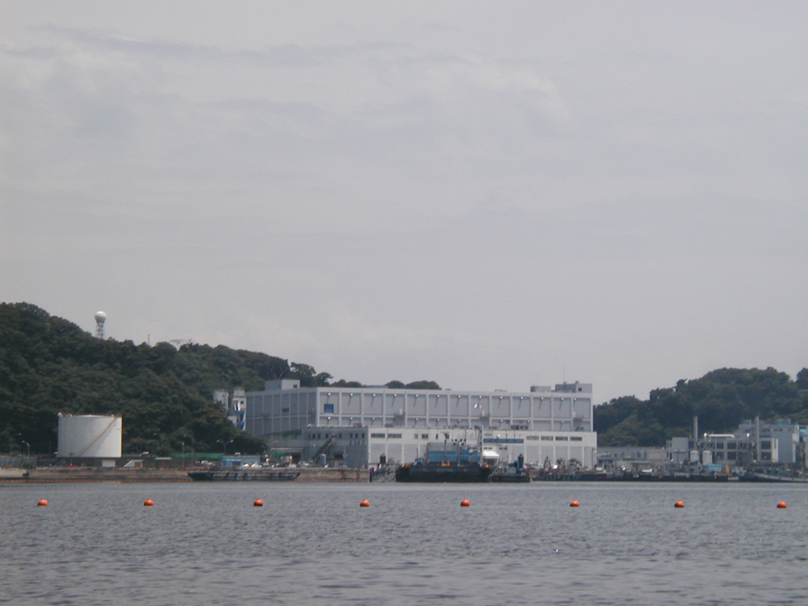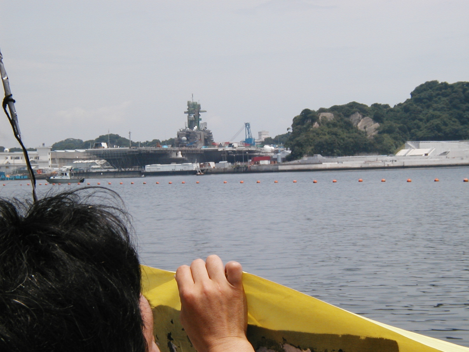 左の写真は6月の定例海上行動、中央に見えるのは6号ドックにて修理中の空母キティホーク、その右白い岸壁は6月13日に延長工事の認められてしまった12号バース、300本の杭を海中に打ち込み、133mの延長桟橋を設け、全長410mの岸壁にする工事で8月には開始するとのこと