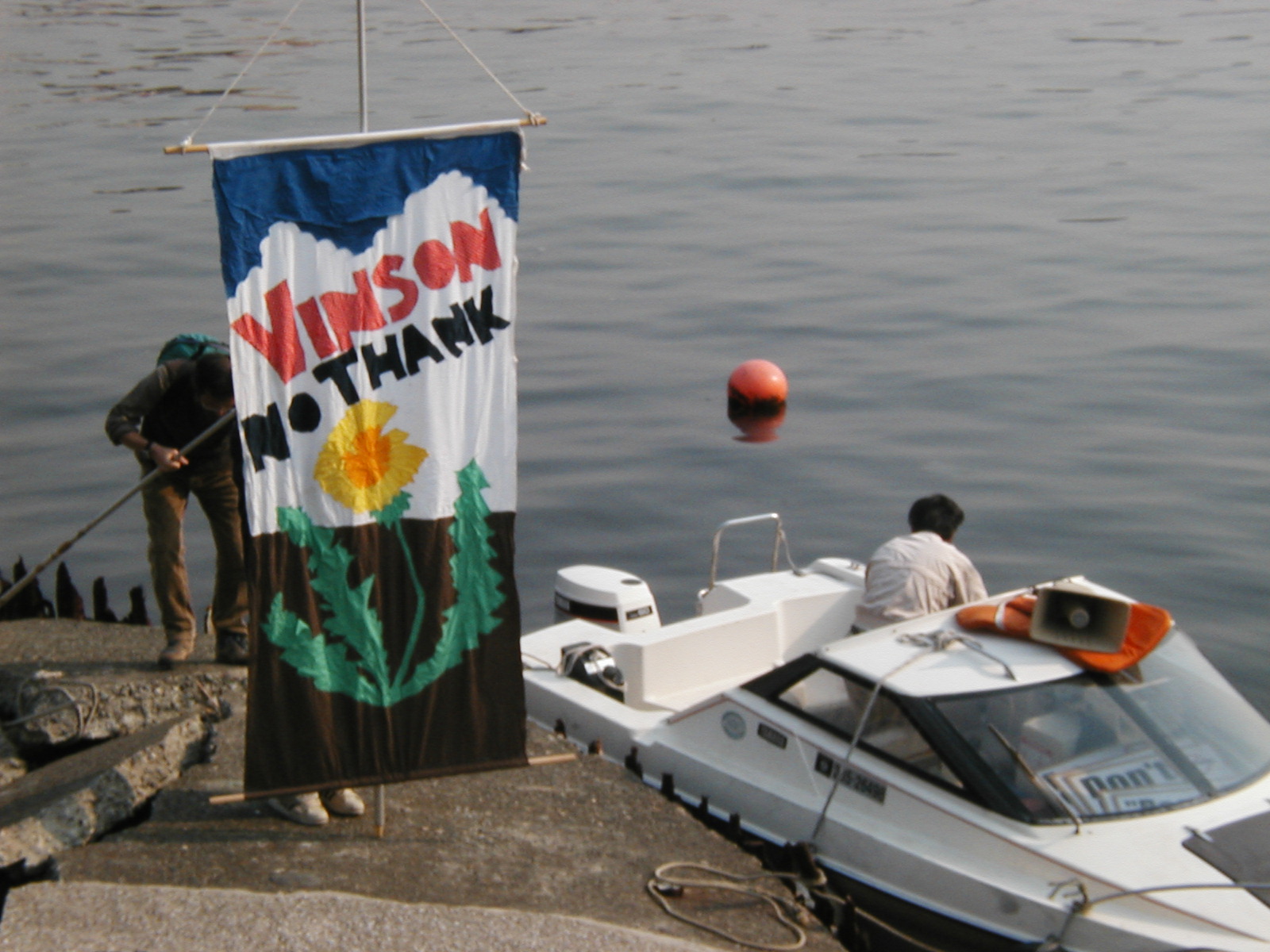 写真は2003年4月27日、定例基地見学時の様子。左は艦船のセーラーに向けて意思表示しているところです。右はエスペランサに乗って帰ってきたときの写真。